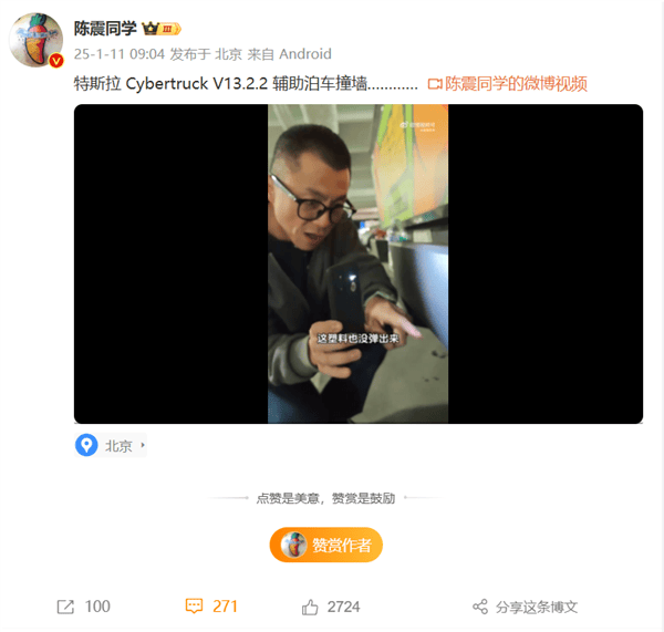 陈震还分享了当时的视频画面,从视频中可以看出,Cybertruck在倒车过程中确实出现了异常的停顿。这次经历让陈震对特斯拉FSD的辅助泊车功能大失所望,他甚至给出了0分的评价,并决定之后还是手动停车更为稳妥。