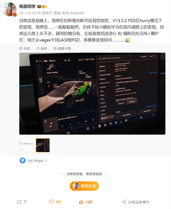 近日,知名汽车博主陈震在社交媒体上分享了一段他在2025年国际消费电子展(CES)期间的独特经历。在美国拉斯维加斯的市中心,他有机会亲身体验了特斯拉Cybertruck搭载的FSD(全自动驾驶)功能。